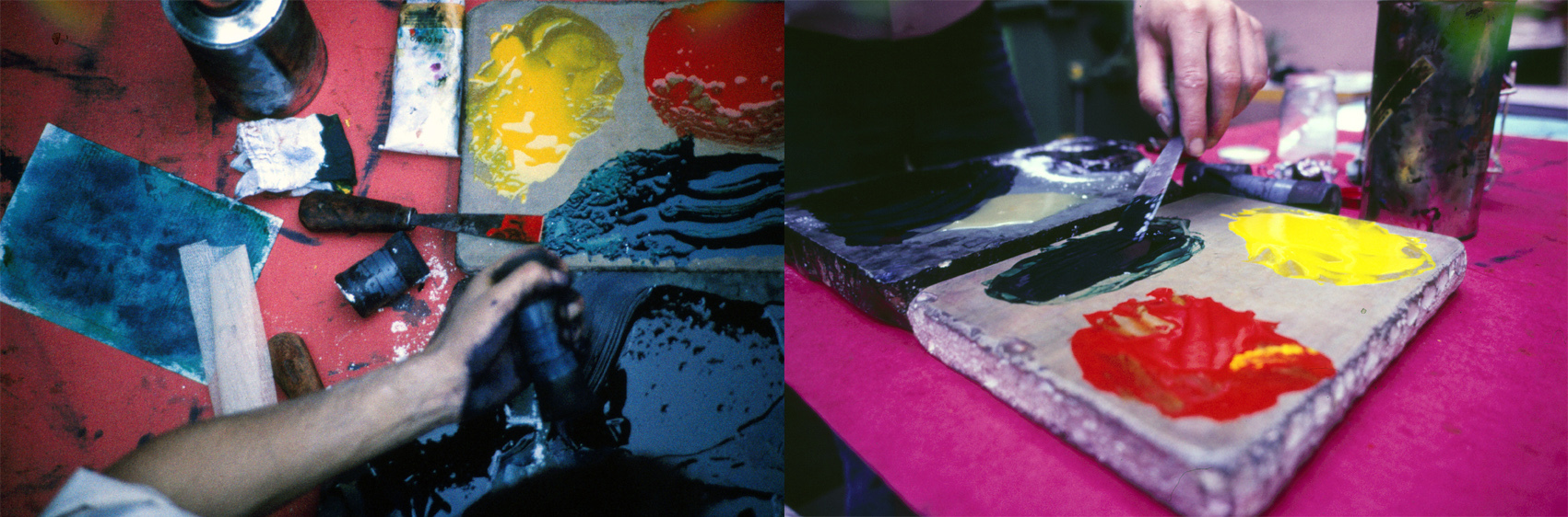 Bei konventioneller Tief- und Hochdruckgrafik liegt der künstlerische Gestaltungsprozess in der Herstellung des Druckstocks. Der Druckprozess ist dabei nur das Reproduktionsverfahren, um ein Bild zu vervielfachen, eine Auflage herzustellen. Bei meinen Arbeiten ist aber gerade der Druckprozess auch künstlerischer Gestaltungsprozess. Ich experimentiere dabei mit unterschiedlichsten Druckstockmaterialien und Einfärbmethoden.